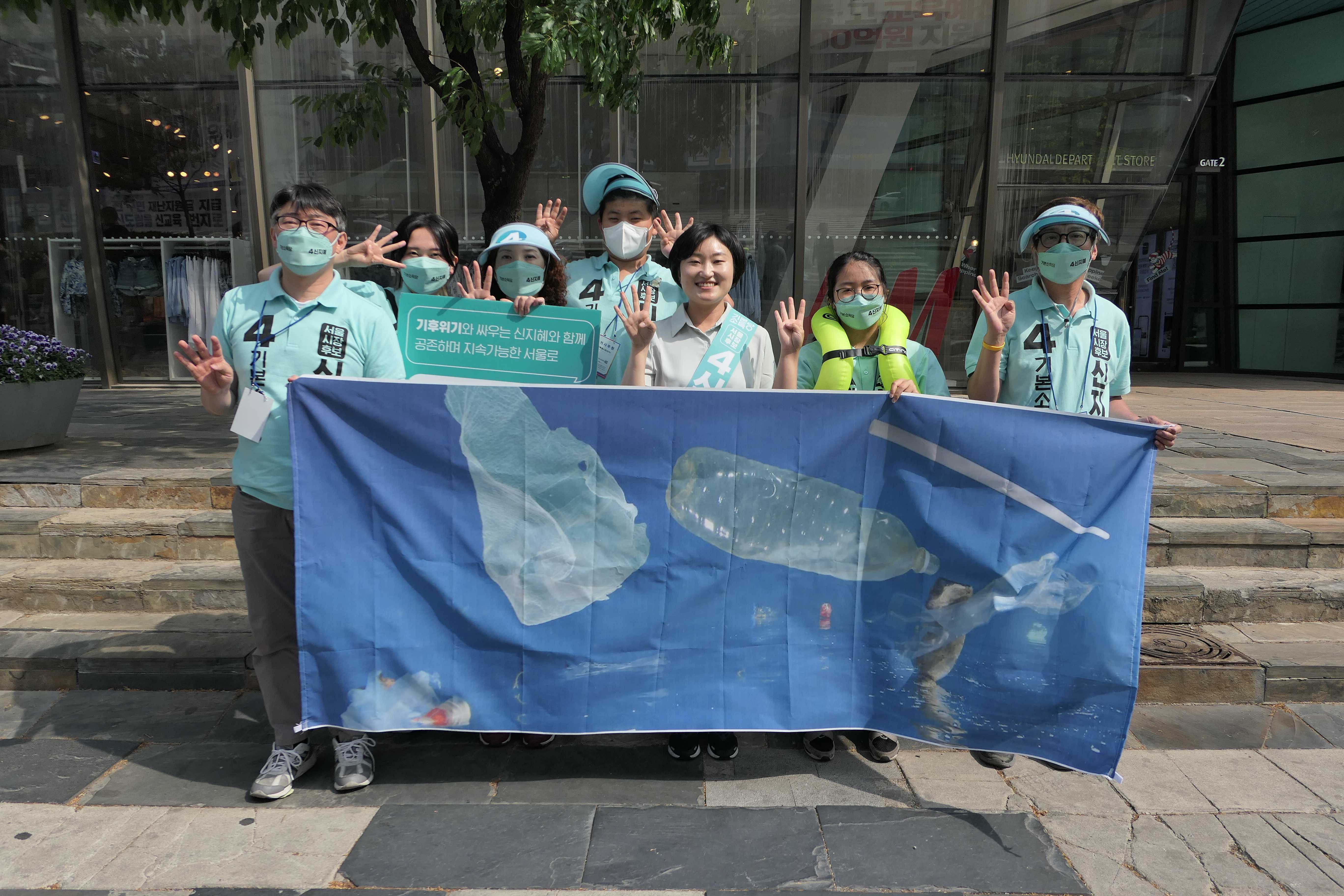 그런 의미에서 해수면이 높아지는 바다를 현수막으로 표현했고, 기후불평등에 시달리는 사람에게 기후위기를 극복할 구명조끼와 같은 공약을 발표했습니다. 기후불평등이 높아질수록 높아지는 해수면, 우리가 낮출 수 있습니다. 그 시작을 이번 지방선거에서 열어주십시오. 기후위기 극복하고, 착취 아닌 공존하는 서울, 기호4번 신지혜와 기본소득당과 함께 해주세요!
