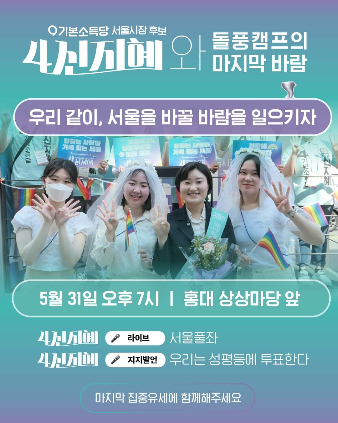 4️⃣신지혜와 돌풍캠프의 13일 간의 여정이 드디어 막을 내립니다. 서울에 기본소득과 성평등 바람을 불러일으킬 신지혜 후보의 마지막 집중 유세에 힘을 모아주세요. '우리는 성평등에 투표한다' 릴레이 지지발언과 틱톡 140만 뷰 전설을 세운 '서울풀좌' 라이브로 우리 같이, 서울을 바꿀 바람을 일으켜요. 우리의 바람이 돌풍이 되도록 집중유세에 꼭 함께 해주세요!