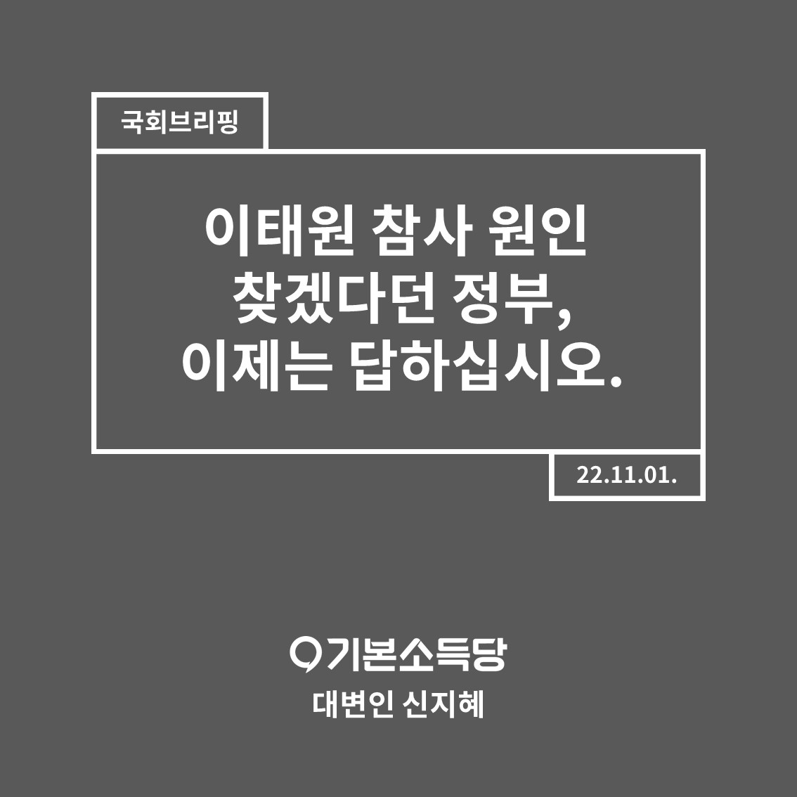국민은 왜 참사를 예방하지 못했냐고 묻고 있습니다. 이 질문에 대한 명확한 대답이 없는 재발 방지 대책은 속 빈 강정이 될 뿐입니다. ‘고의로 밀었다는 누군가 찾기’에 경찰이 혈안 돼도 국민의 핵심을 찌르는 질문을 멈추지 않을 것입니다. 이태원 참사 희생자가 또 늘었습니다. 정부는 감언이설을 멈추고, 안전 예방 행정의 거대한 구멍을 찾을 계획을 발표하십시오.