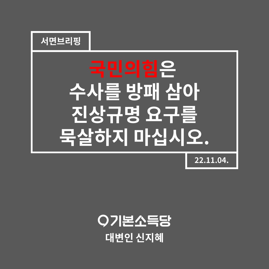 기본소득당은 국민의 요구를 받아안아 참사 진상규명을 위해 할 수 있는 모든 일을 하겠습니다.