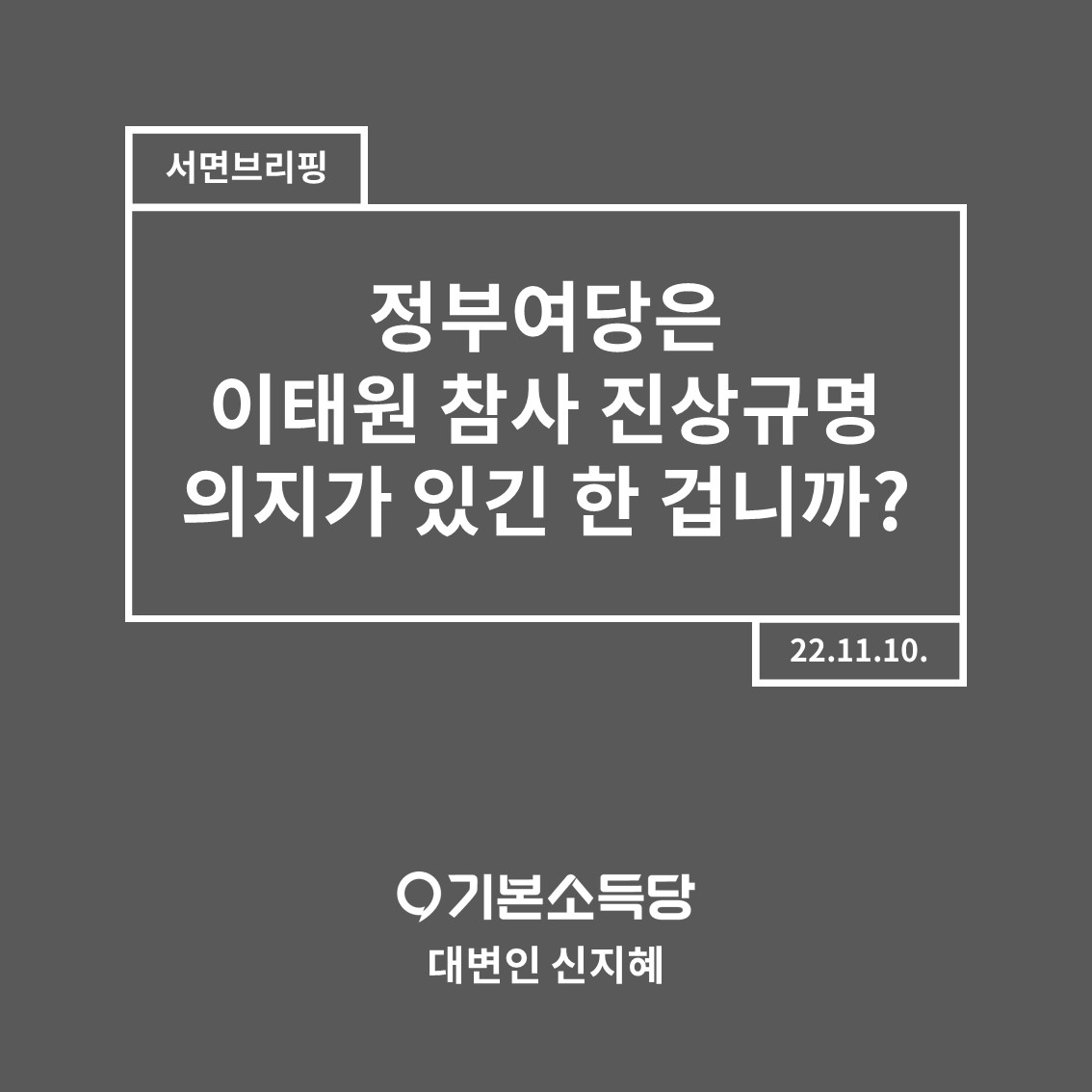 | 이태원 참사 원인 찾겠다던 정부, 이제는 답하십시오. (0) | 2022.11.01 |