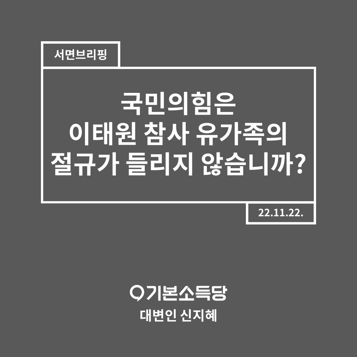 오늘 이태원 참사 유가족이 눈물 젖은 기자회견을 했습니다. 유가족의 심경 발표와 함께 정부에 대한 6가지 요구사항을 발표했습니다. 그 중 국회가 책임을 다해야 할 부분은 ‘성역 없는, 엄격한, 철저한 책임규명’과 ‘피해자들의 참여를 보장하는 진상 및 책임규명’일 것입니다.