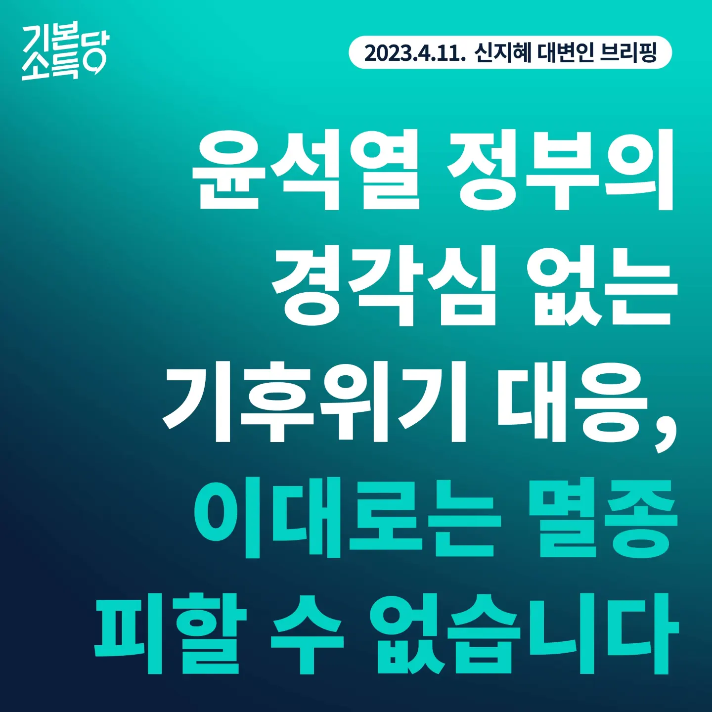 탄소중립 기술 개발을 국가가 주도하면서 향후 대한민국의 지속적인 성장까지 연결하는 큰 비전이 절실한 때입니다. 기본소득당은 지난 대통령선거에서부터 국가가 투자한 만큼 주주가 되고, 그 수익을 국민과 함께 나누는 ‘공유지분형 그린뉴딜’을 제안한 바 있습니다. 정부 역시 기후위기 시대의 국가 성장 비전을 다시 쓰려고 노력하지 않는다면, 멸종위기의 책임을 반드시 치를 것입니다.