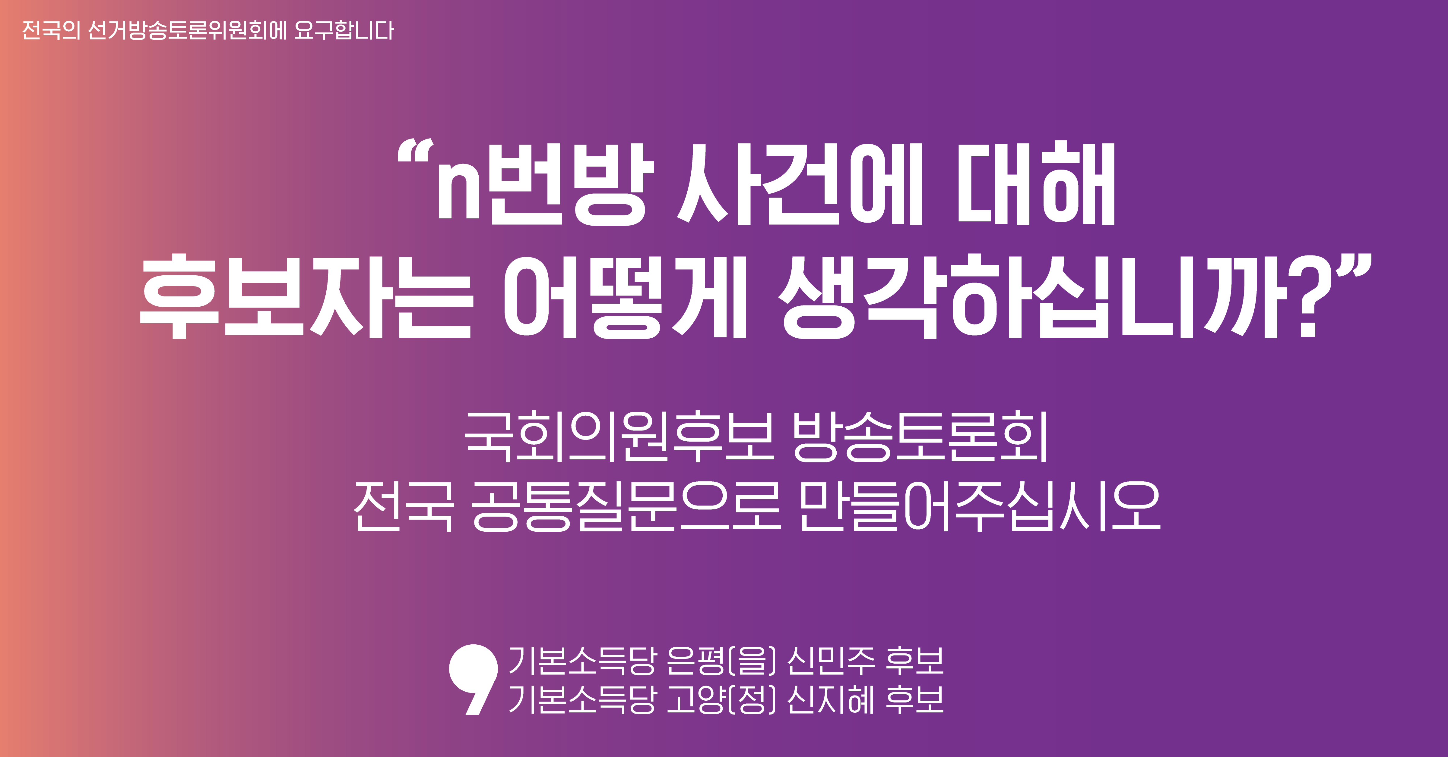 이번 선거를 통해 n번방 사건의 반복을 막기 위해 노력하는 국회, 모든 국민의 안전을 책임지는 국회를 만들어야 합니다. 공범자가 아니라 디지털 성폭력을 근절시킬 이들이 국회에 가야 합니다. 따라서 우리는 21대 국회의원 후보들의 n번방 사건과 디지털성폭력 원천봉쇄에 대한 생각과 정책을 확인하기 위해 21대 국회의원선거 방송토론회 공통질문으로 전국 모든 후보자에게 n번방 사건에 대해 물을 것을 요구합니다.