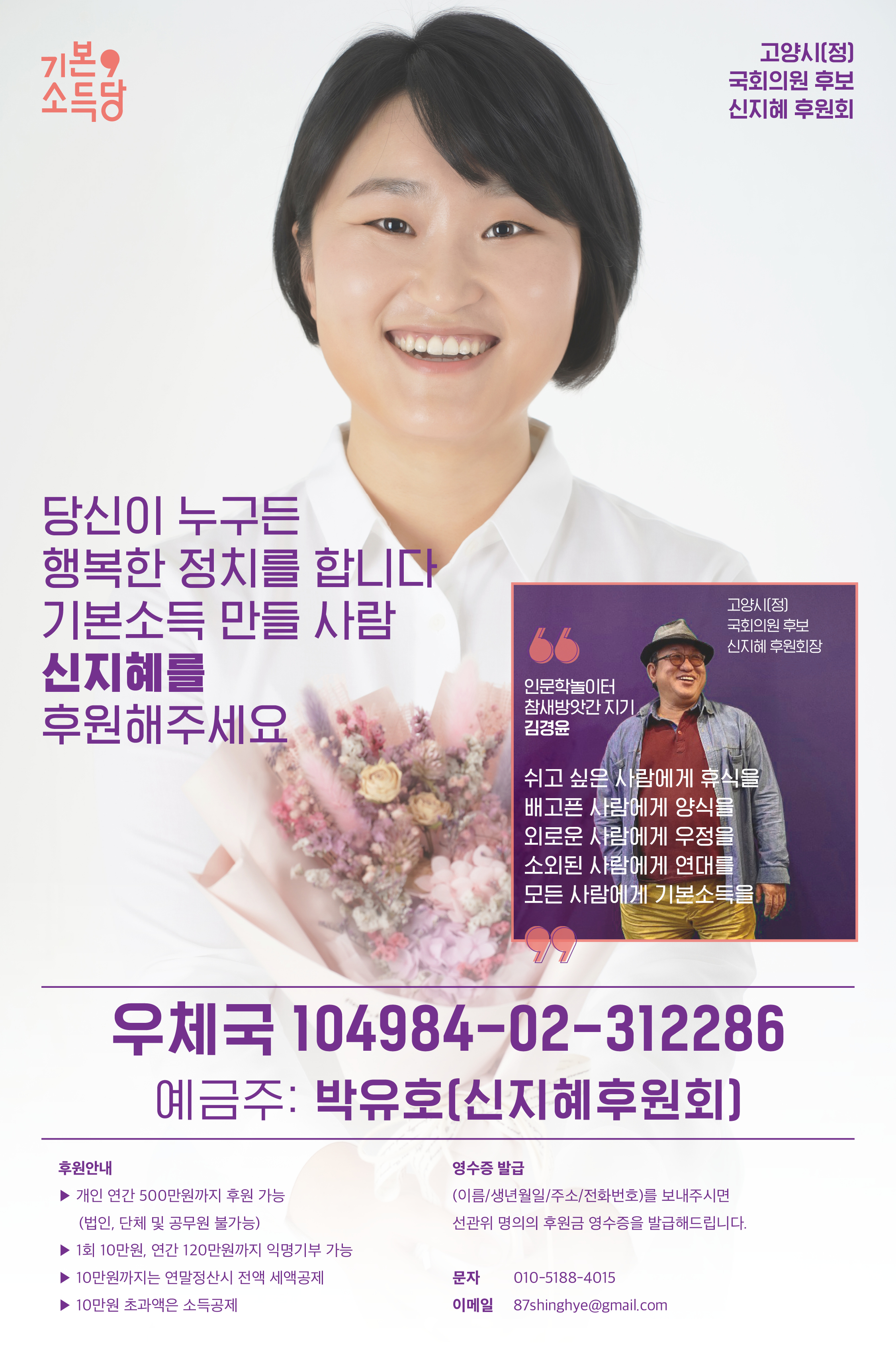 후원회장은 저와 지난 몇년간 고양시에서 인연을 맺고 있는 김경윤작가님께서 맡아주셨습니다. 기본소득과 신지혜를 지지하는 마음에 따뜻한 정치로 꼭 보답하겠습니다.