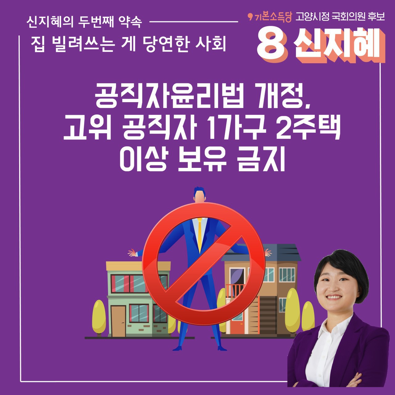 또, 부동산정책으로 고위공직자가 혜택 받는 일이 없도록 고위공직자 1가구 2주택 이상 보유하지 않도록 하겠습니다.