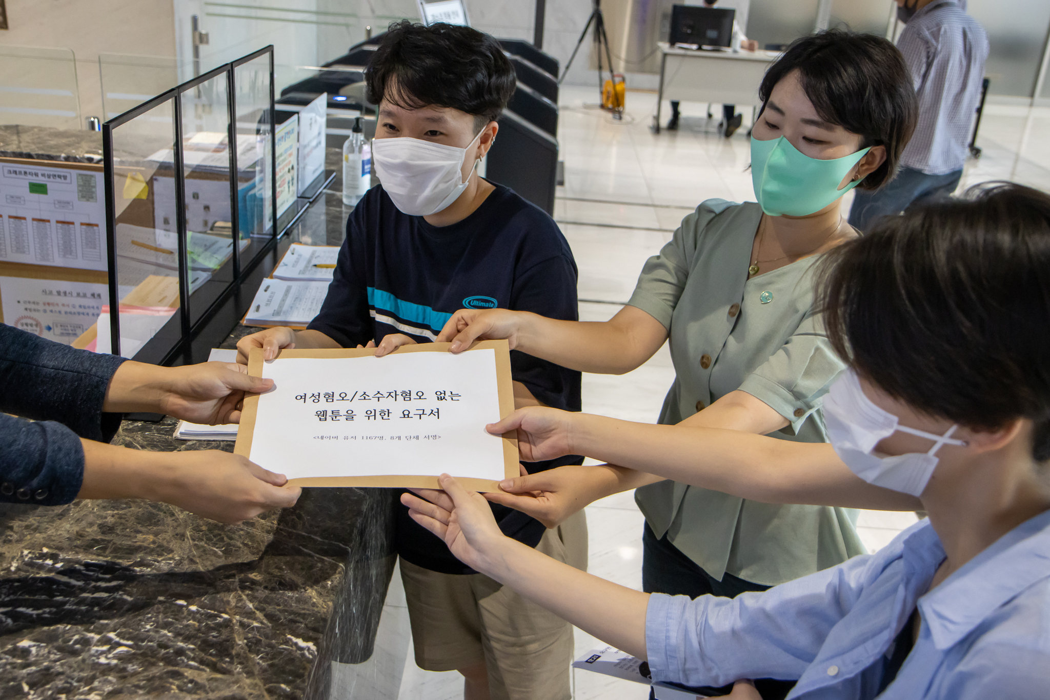 마스크를 쓰고서라도 1,167명 네이버이용자들의 목소리를 전하기 위해서 최소한의 인원으로 네이버웹툰 본사까지 찾아갔습니다. 저는 오늘 두 가지 이유로 기자회견에 함께 하게 됐습니다.