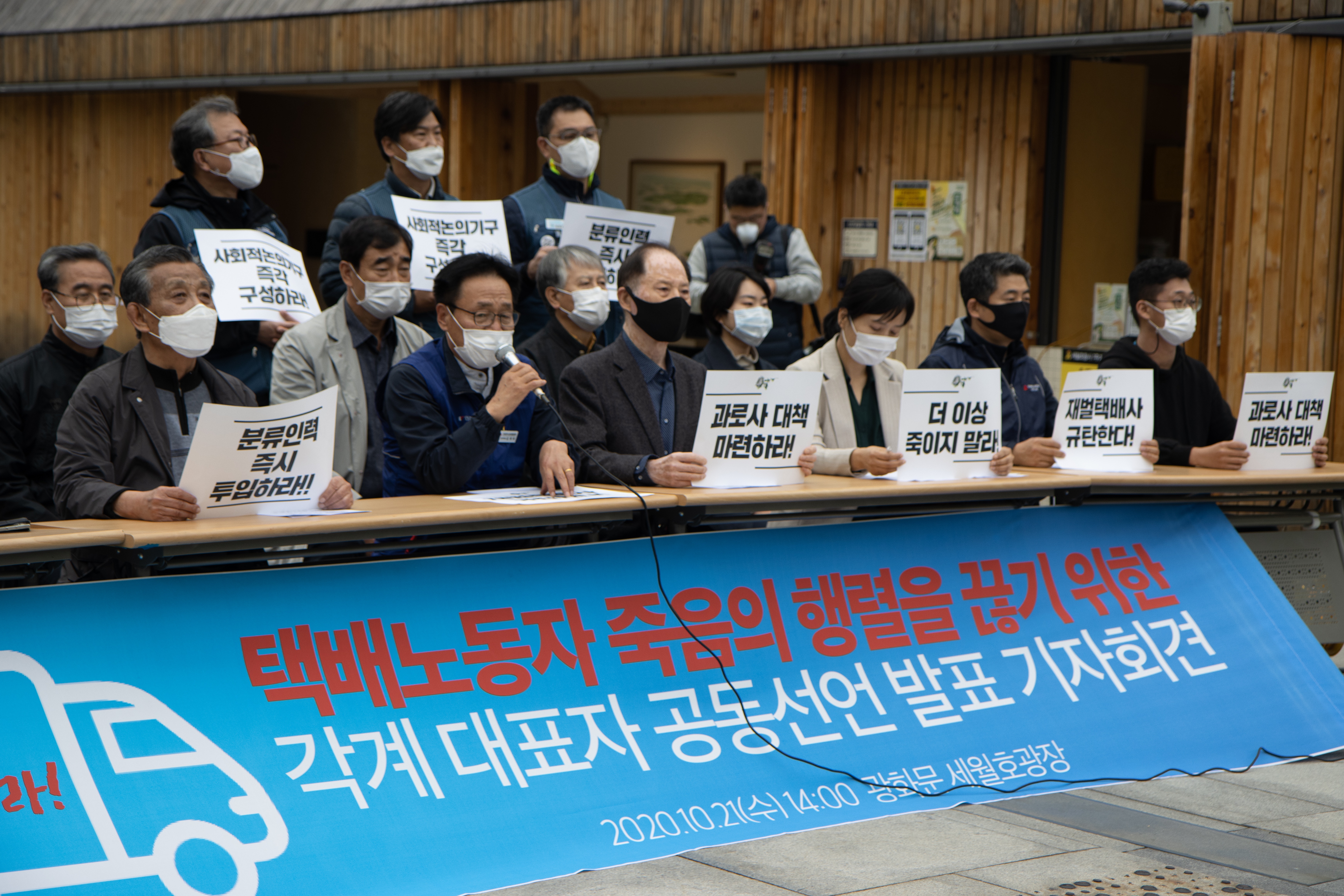 오늘 택배노동자 과로사 대책위에서 주최한 사회각계 대표자 긴급 공동선언 기자회견에 함께 했습니다. 며칠 전 문재인 대통령이 택배업체가 산재적용제외 각서를 종용해왔던 것에 언급하며, 택배노동자도 산재적용 받을 수 있도록 조치하라고 했습니다. CJ대한통운의 택배노동자가 과로사하고 난 뒤 산재적용제외 각서 때문에 산재조치도 받을 수 없다는 것이 드러났기 때문입니다. 먹고 살기 위해서 이런 갑질 계약에 서명할 수밖에 없었던 것이 택배노동자의 현실입니다.