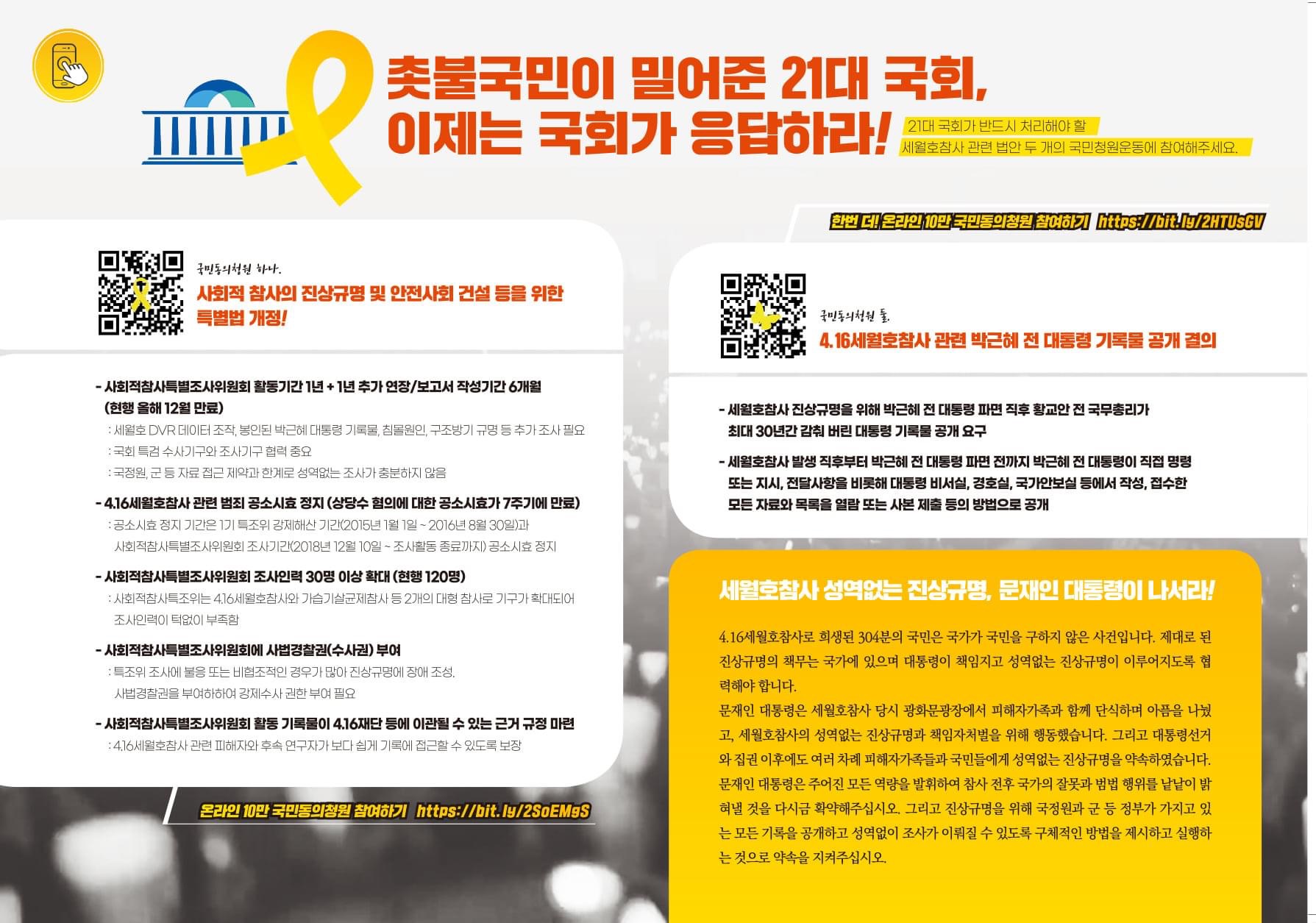 4.16연대와 유가족이 함께 한 국회입법청원 10만 명이 넘어 국회에 회부되었다는 소식입니다.