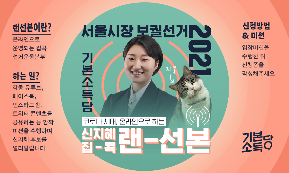 카카오톡, 페이스북, 트위터, 인스타그램 등 SNS 이용자라면 누구나 참여하실 수 있어요. 기본소득당 서울시장 후보 신지혜의 약속이 담긴 콘텐츠를 더 많은 사람에게 전하는 일, 서울을 바꾸는 랜선본에 지금 바로 함께해주세요!