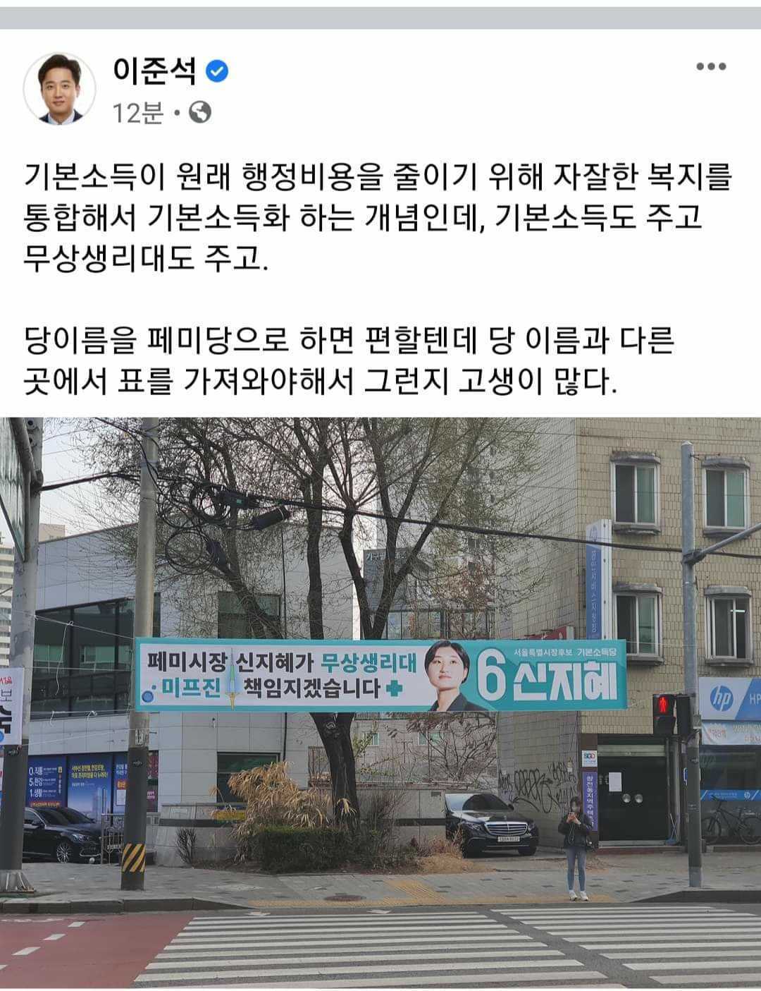 어제 이준석 전 최고위원의 페이스북에서 제 현수막 사진과 함께 게시한 ‘기본소득이 원래 행정비용을 줄이기 위해 자잘한 복지를 통합해서 기본소득화 하는 개념’이라는 글을 보니, 기본소득에 대해 몰라도 너무 몰라 놀랐습니다. 국민의힘이 정의도, 목적도, 내용도 어떤 것도 맞지 않아도 ‘기본소득’이라 붙이는 몰염치가 이해될 정도였습니다.