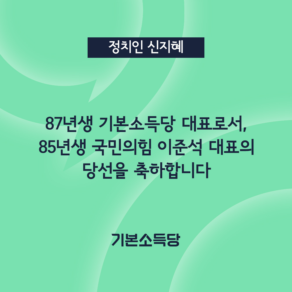이준석 대표의 당선으로 대한민국의 새로운 사회계약을 무엇으로 만들어야할지 미래를 향한 경쟁이 시작되었다고 느낍니다. 기본소득당은 출발에서의 공정한 기회를 넘어 대한민국의 공통부 수익을 ‘한 사람도 빼놓지 않고’ 공정하게 나누는 기본소득을 새로운 사회계약으로 만들고자 노력하고 있습니다.