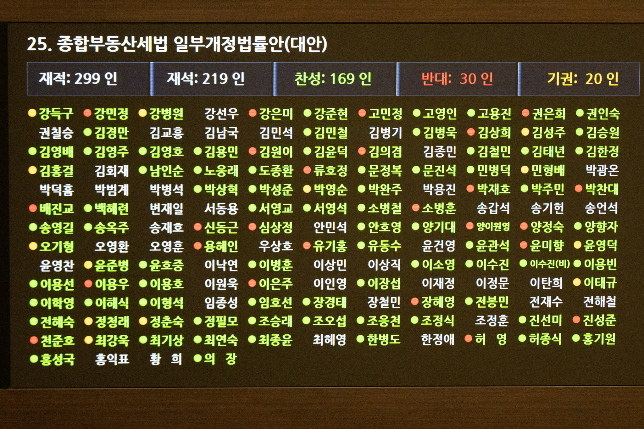 재석 219명 중 찬성의원 169명, 반대의원 30명, 그리고 기권한 의원 20명. 이렇게 공시가격 11억 이하 1주택보유자는 아예 종부세를 면제하고, 11억 이상 주택에도 종부세를 감면해주는 ‘부동산 부자 감세법’이 통과되고야 말았습니다.