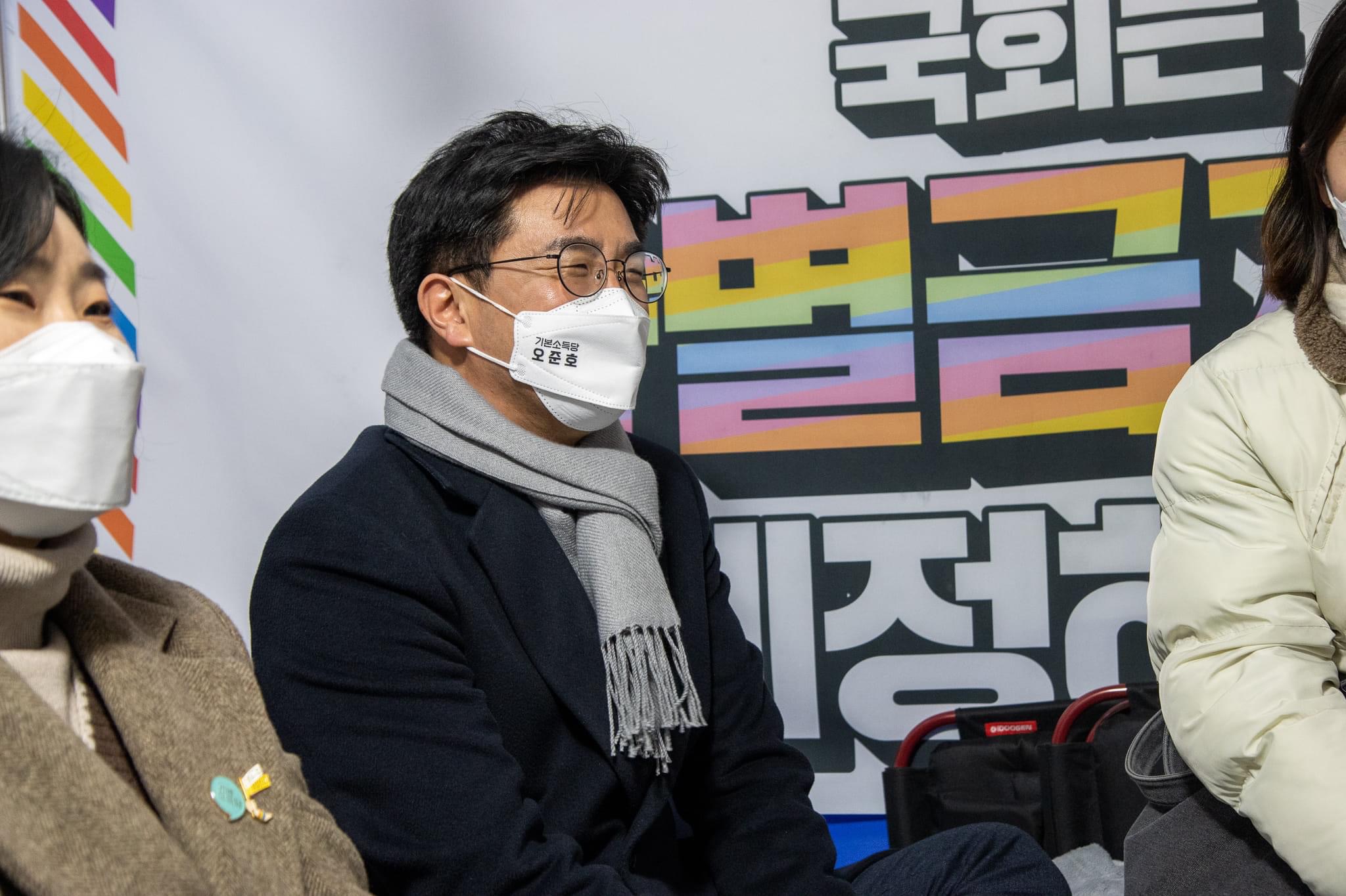 어제 한파가 시작된 날, 차별금지법 연내 제정을 요구하는 천막에서 짧은 간담회를 가졌습니다. 기본소득당 용혜인 의원도 차별금지법 공동발의 했기 때문에 차별금지법 반대하는 사람들의 항의전화에 시달려야 했습니다. 한 달 넘게 이어진 의원실로 온 항의전화 응대했던 오준호 비서관이 기본소득당 대통령 후보가 되어 차별금지법 제정을 위해 애쓰시는 분들을 만났습니다.