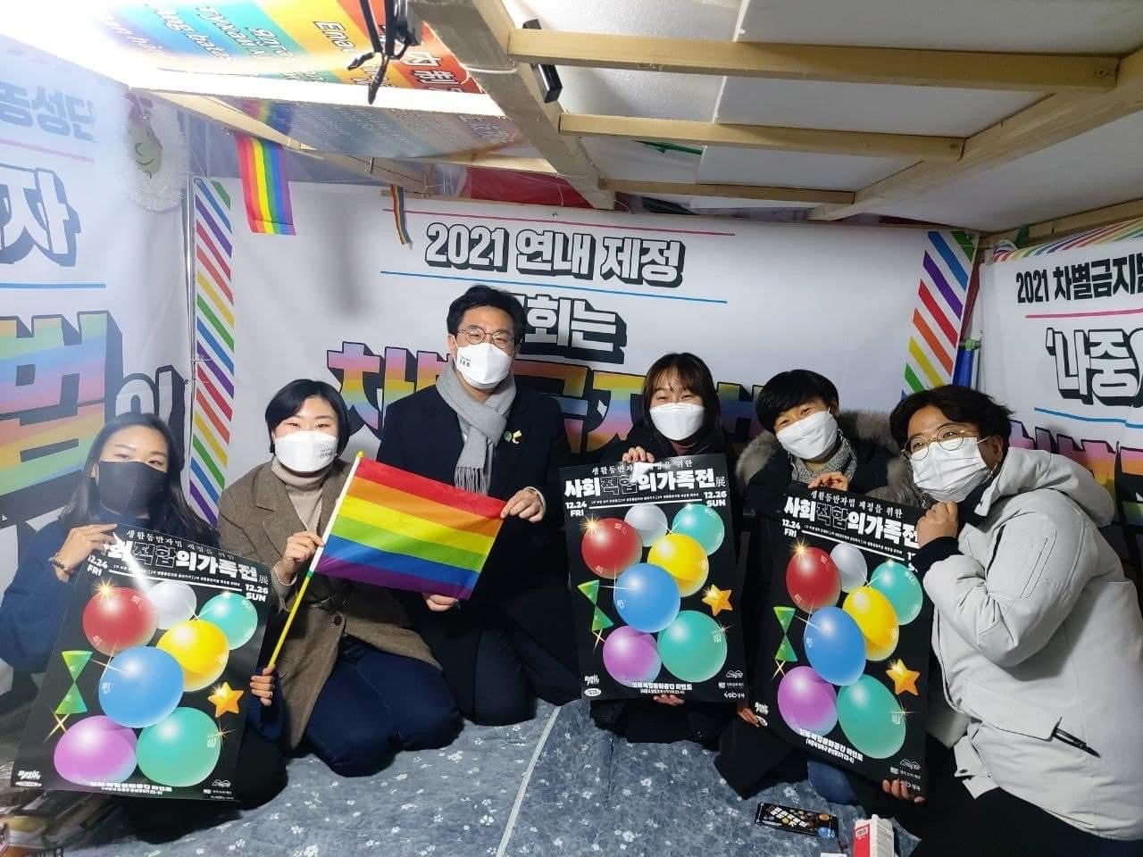 경찰 제지 때문에 허리도 못 펴는 농성장, 밤새 한파를 견디며 천막에 있어야 하는 분들을 생각하니 정말 발길이 떨어지지 않았습니다😿 어제 간담회 함께 해주신 분들께 감사드리고, 기본소득당도 차별금지법 연내 제정을 위해 더더더더더 애쓰겠습니다.