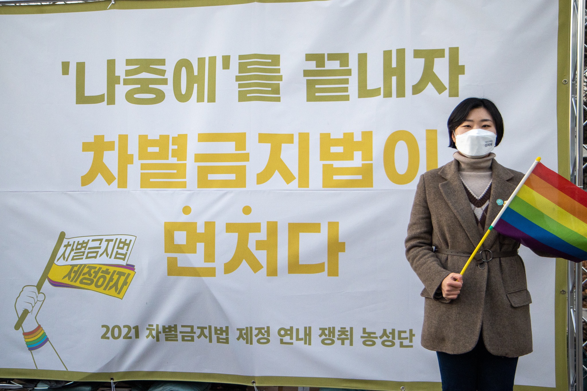 천막 농성이 이어지는데도 대선 후보들의 ‘차별금지법 나중에’ 입장이 계속 이어져 참 바쁘셨다 합니다. 이재명 후보의 ‘다 됐죠?’, 윤석열 후보의 ‘평등 강제해선 안 된다’ 발언은 국민 인권을 보호할 국가 책임을 방기하는 것입니다. 오준호 후보도 ‘모두에게 기본소득’과 ‘모두에게 평등’을 요구하는 차별금지법이 함께 가야 한다는 것 강조하셨습니다.