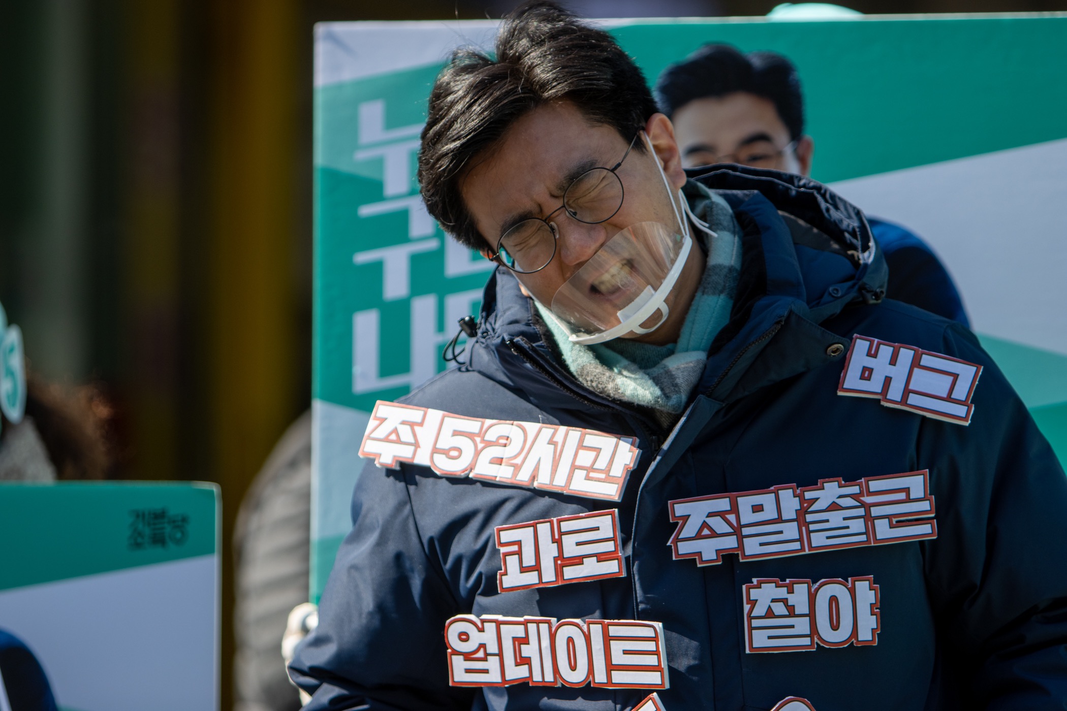 유세 3일차, 가산디지털단지역에서 특별한 포퍼먼스를 했습니다. IT노동자가 많이 일하는 곳에서 과로에 고통받는 현실을 기본소득 처방으로 바꿔나가자는 취지의 퍼포먼스였습니다. 오준호 후보가 과로에 시달리는 노동자의 현실을 몸에 붙이고 고통받는 모습을 표현해주셨습니다. 저와 유세단이 기본소득 처방으로 고통을 몸에서 떼어내자 묵은 체증이 내려간 듯 상쾌한 상태로 변했습니다. 오준호 후보가 표정으로 만들어 낸 퍼포먼스였습니다.