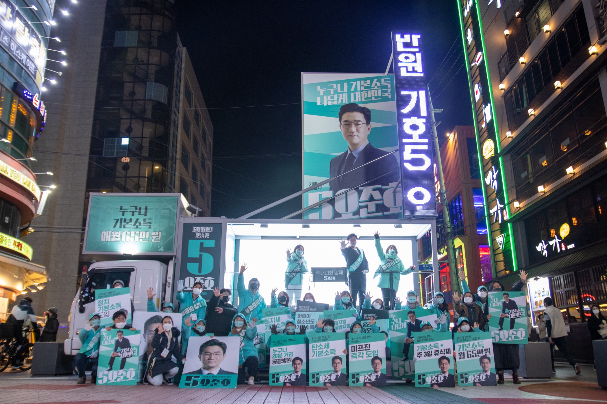 존경하는 국민 여러분, 아직 어떤 후보 찍을지 마음의 결정을 못하셨다면, 여기에서 우리 국민 여러분께 직접 인사드리고 있는 기본소득당 대통령 후보 기호 5번 오준호에게 투자해 주십시오.